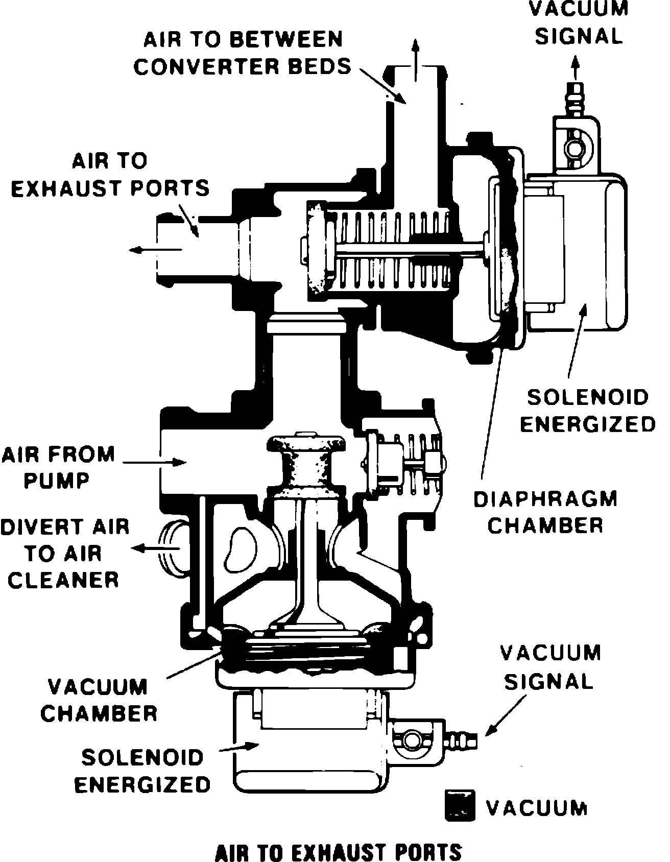 During normal operation the ECM energizes the air control (lower) solenoid, Fig. 14. Manifold vacuum holds the valve open and air is directed to the air switching valve. If engine is operating in ``Open Loop'' mode, the ECM energizes the air switching (upper) solenoid, Fig. 15, and manifold vacuum opens the air passage to the exhaust ports. If engine is operating in ``Closed Loop'' mode, the air switching solenoid is de-energized, and spring tension opens the air passage to the catalytic converter.