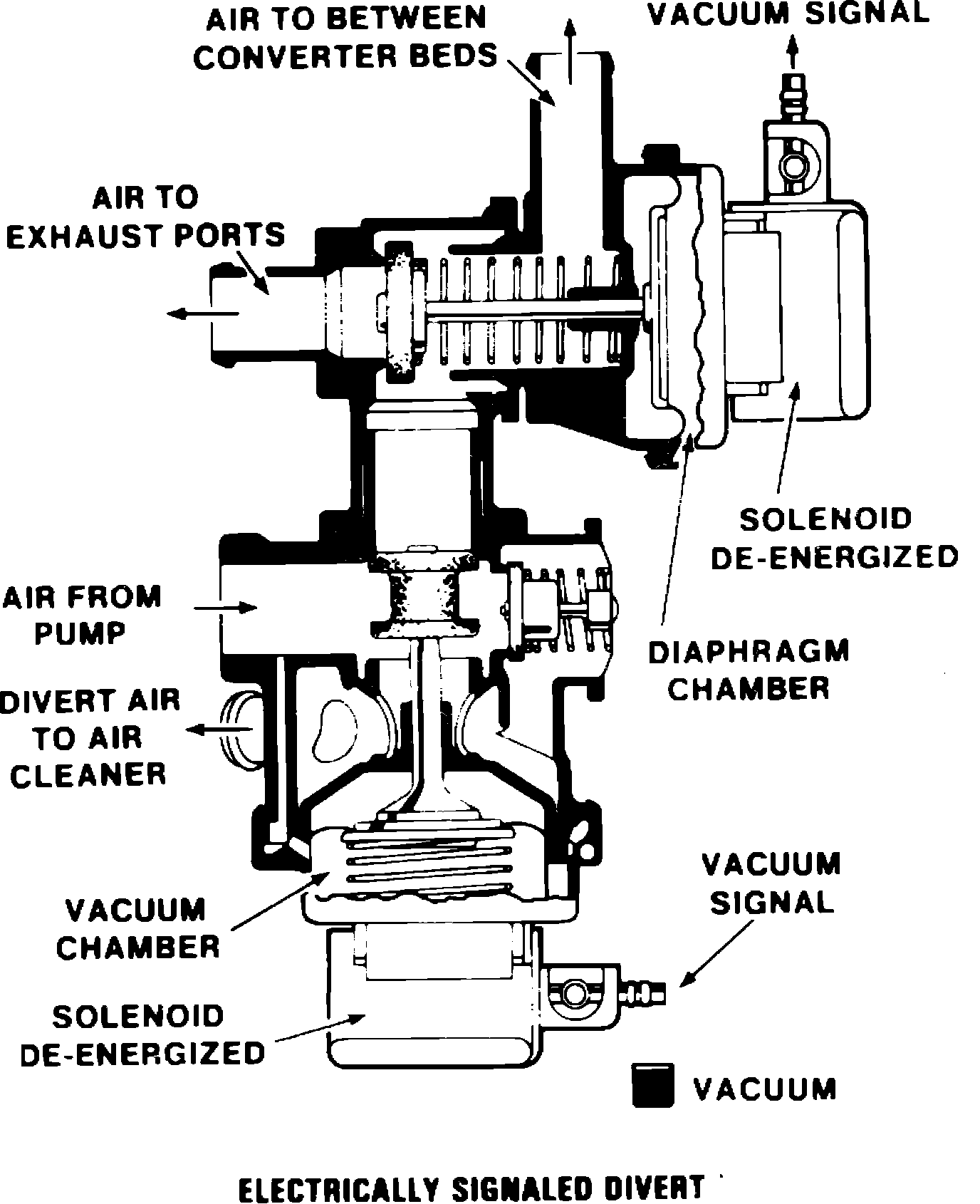 Electric divert air control and electric air switching are combined into one valve assembly, which can be identified by the vacuum signal hose position, Fig. 13. The valve is operated by vacuum signals which are solenoid-controlled through an Electronic Control Module (ECM).