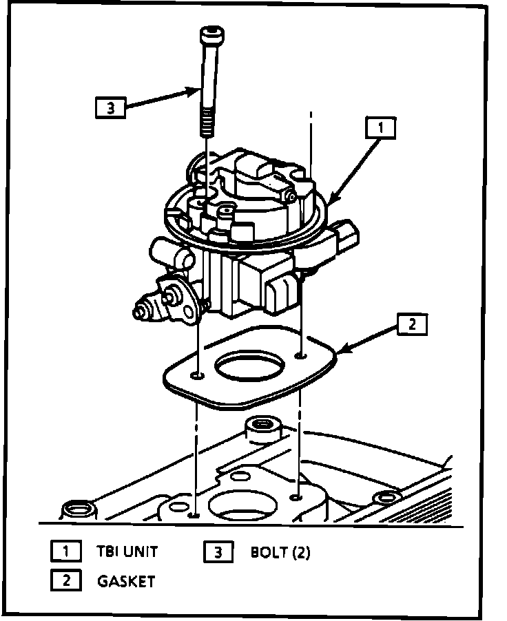 3. Remove fuel feed and return lines. Use a backup fuel line wrench on the TBI fuel nuts to prevent them from turning.