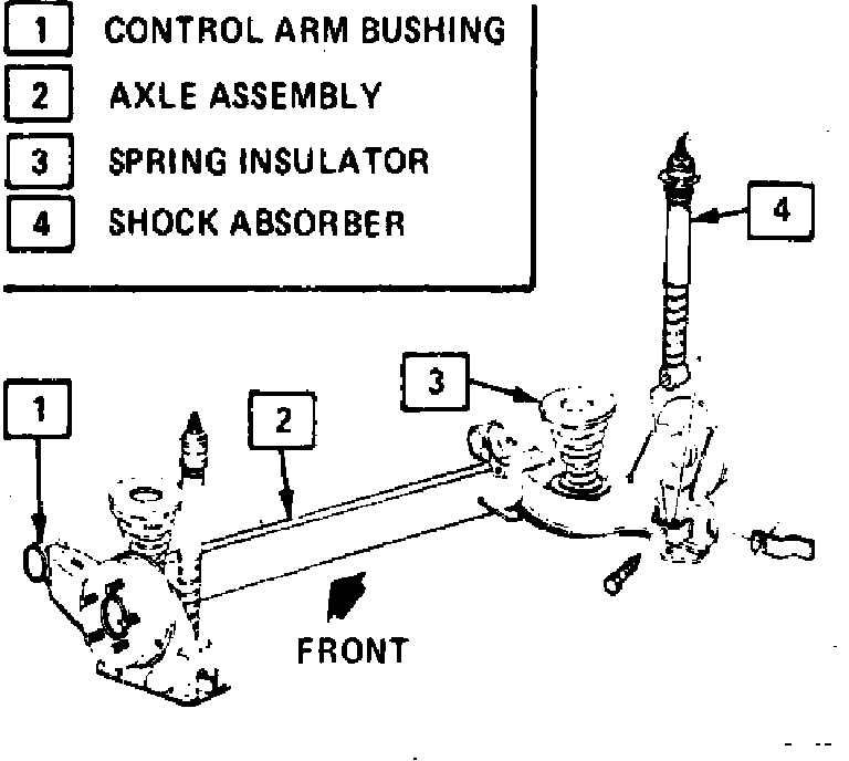 The rear suspension, Fig. 1, is a semi-independent type suspension consisting of an axle assembly with trailing arms and twisting cross beam, coil springs and double action shock absorbers. A stabilizer bar is available and is attached to the inside of the axle beam and to the lower end of the control arms. A single unit hub and bearing assembly is bolted to each end of the axle assembly. The hub and bearing assembly is a sealed, non-serviceable unit and must be replaced as an assembly.