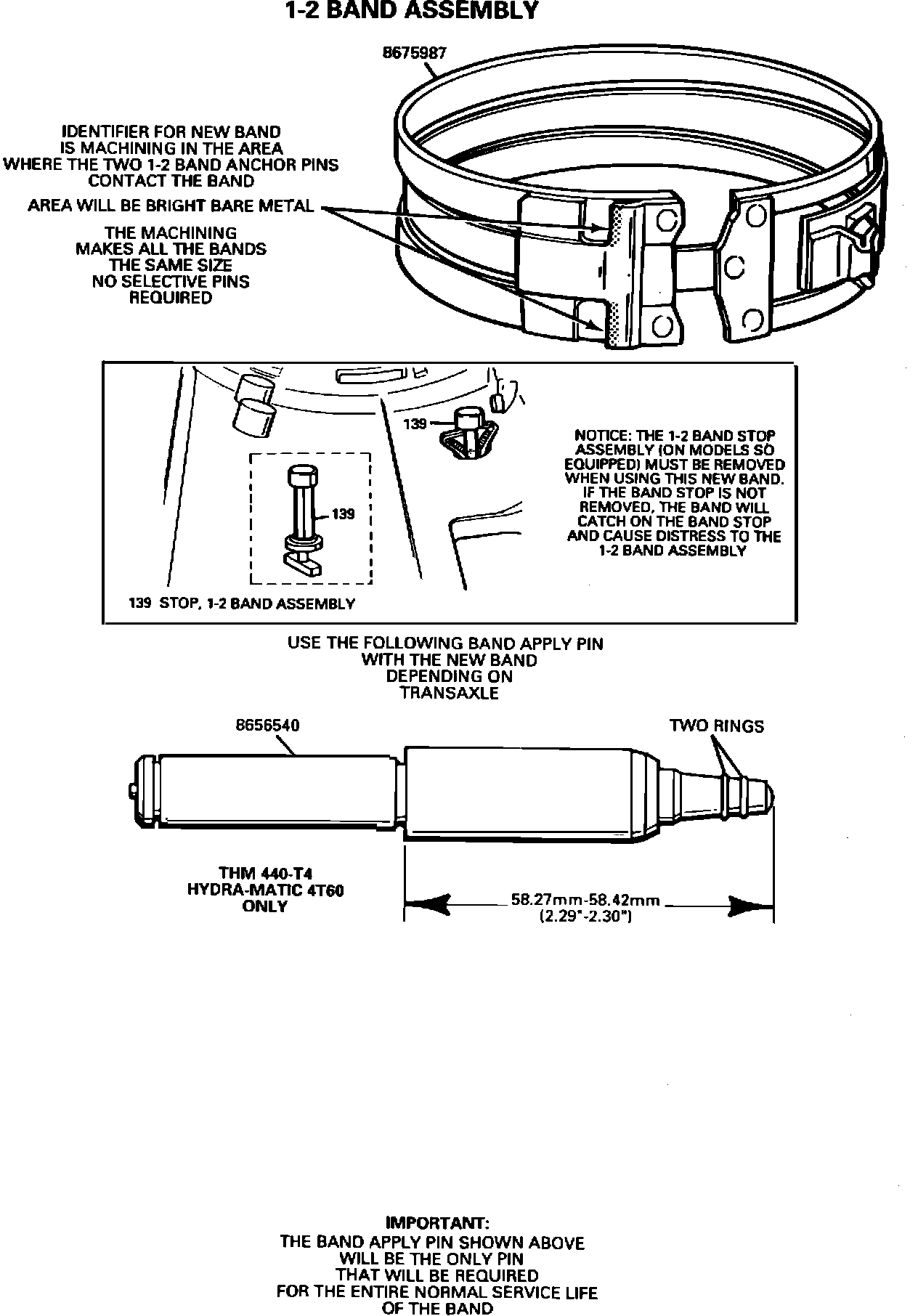 IMPORTANT: If ordering a new 1-2 or reverse band, the correct band apply pin must be used with the band. The correct band apply pin is not included with the new band service package(s) (that includes an instruction sheet about the non-selective band apply pin band). The proper band apply pin must be ordered separately.