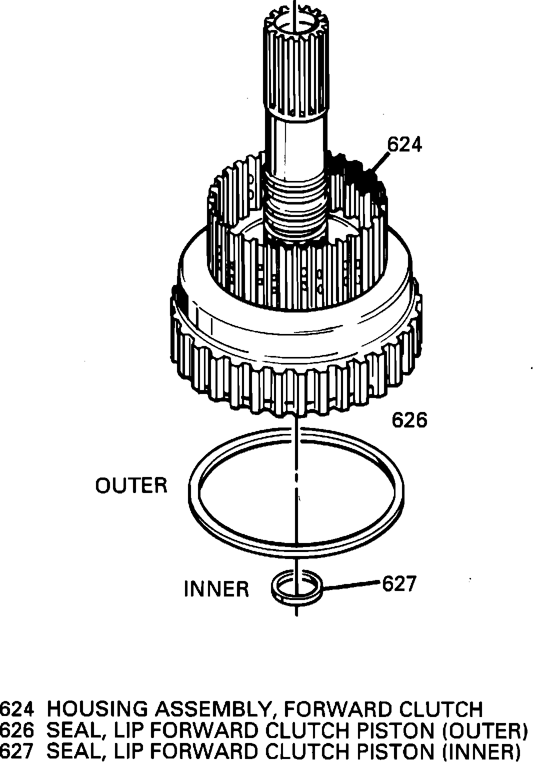 New Forward Clutch Piston Seals (626, 627) made of Viton(R). These new Viton(R) seals replace the currently used lip seals which may become brittle and take a permanent heat set (become flat) with high mileage, allowing possible leaks in the forward clutch (624). Refer to Figure 1.