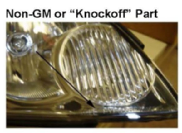 These non-GM headlamp assemblies (referred to as "knock-offs") are not made to GM specifications. Also, the appearance of these headlamp assemblies are very close to the genuine parts. Refer to the figures below.