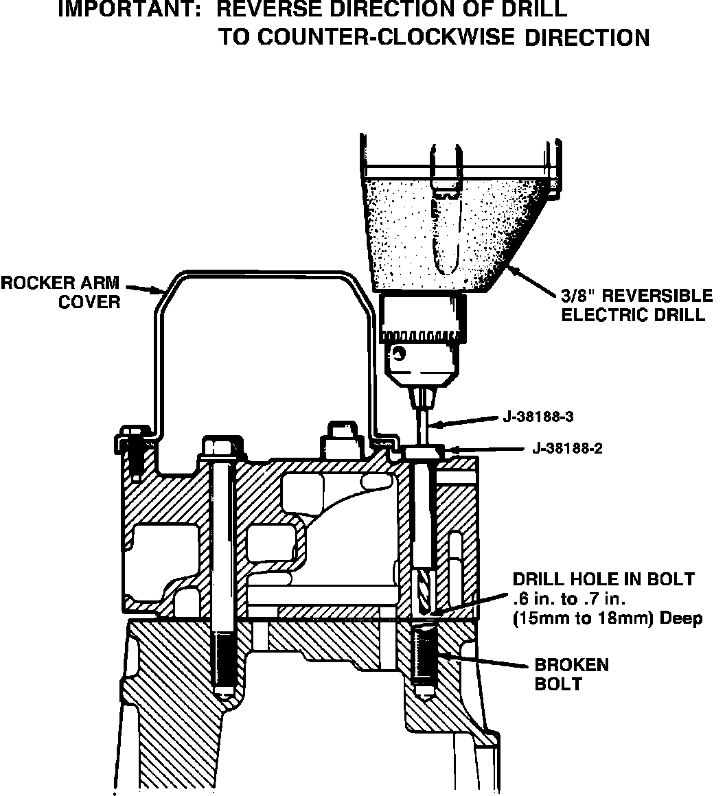 IMPORTANT: TOOL J-38188-3 IS A LEFT-HAND TWIST DRILL - IT IS CRITICAL THAT THE ROTATION OF THE ELECTRIC DRILL BE REVERSED PRIOR TO USING THE DRILL ROTATION OF THE DRILL SHOULD BE COUNTER-CLOCKWISE.