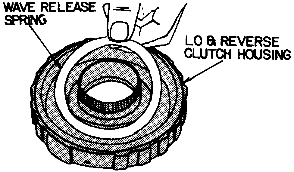 6. Compress Lo and Reverse clutch spring retainer and remove snap ring, spring retainer, waved spring and clutch piston.