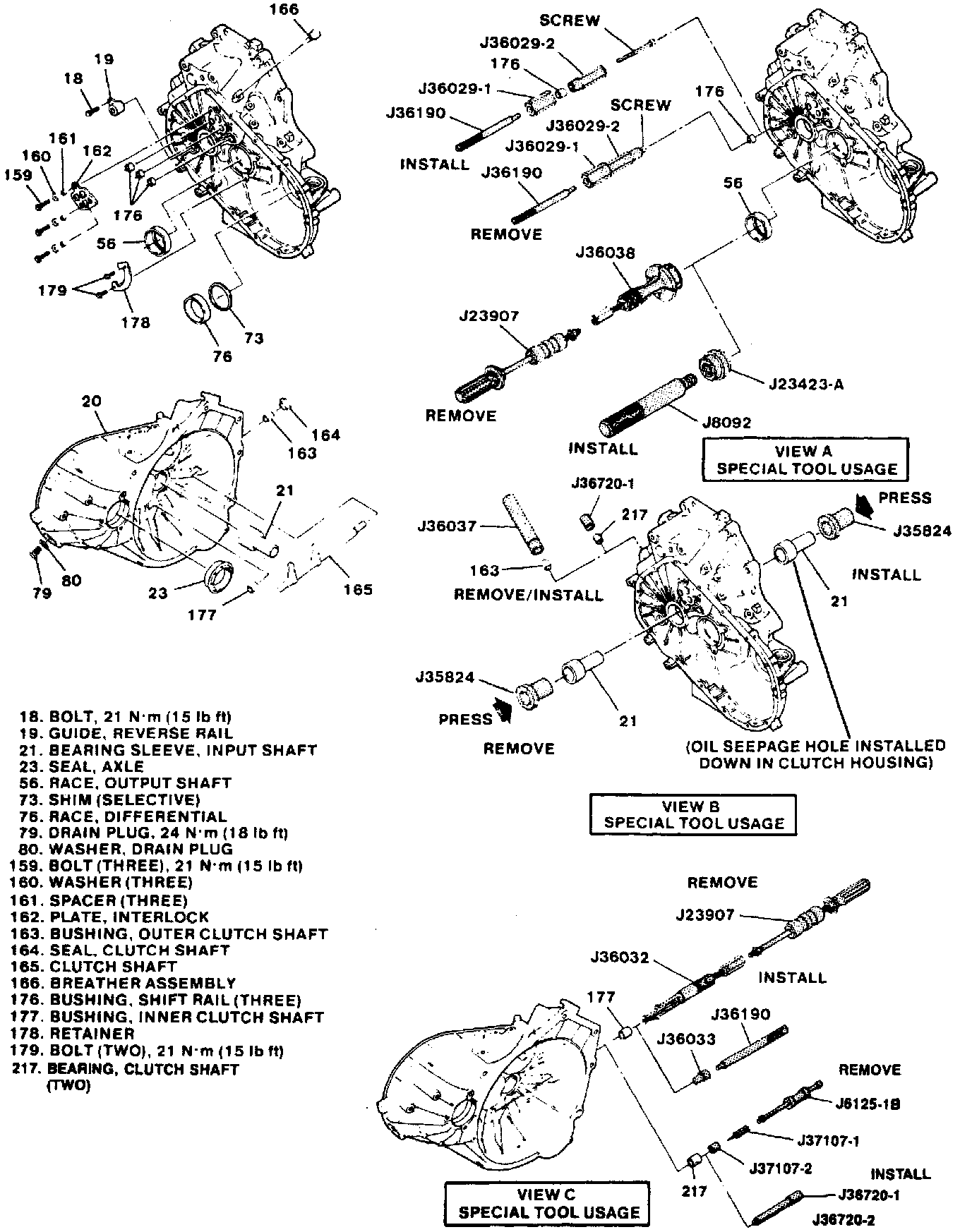 11. On models with external clutch release only, remove bushing (177) using tools J-36032 and J-23907 (view C, accompanying image).