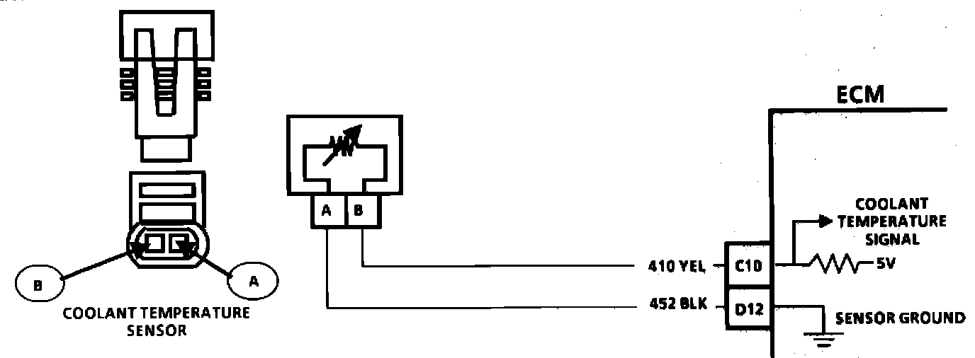 The Coolant Temperature Sensor uses a thermistor to control the signal voltage to the Electronic Control Module (ECM). The ECM applies a voltage on CKT 410 to the sensor. When the engine is cold the sensor (thermistor) resistance is high, therefore the ECM will see high signal voltage. As the engine warms, the sensor resistance becomes less, and the voltage drops. At normal engine operating temperature (85 to 95 Degrees C) the voltage will measure about 1.5 to 2.0 volts.