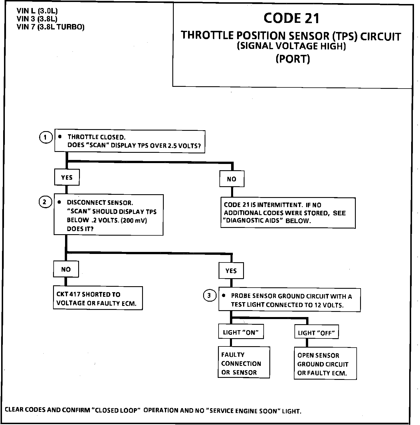 A "Scan" tool reads throttle position in volts. With closed throttle, ignition "ON" or at idle, voltage should be .40 volts +/- .05 volts on 3.8L, 3.8L TURBO ;.55 volts +/- .05 volts on 3.OL . Also some "Scan" tools will read throttle angle 0% = closed throttle 100% = WOT. An open in CKT 452 will result in a Code 21. Refer to "Intermittents" in DIAGNOSIS BY SYMPTOM - NO TROUBLE CODE STORED.