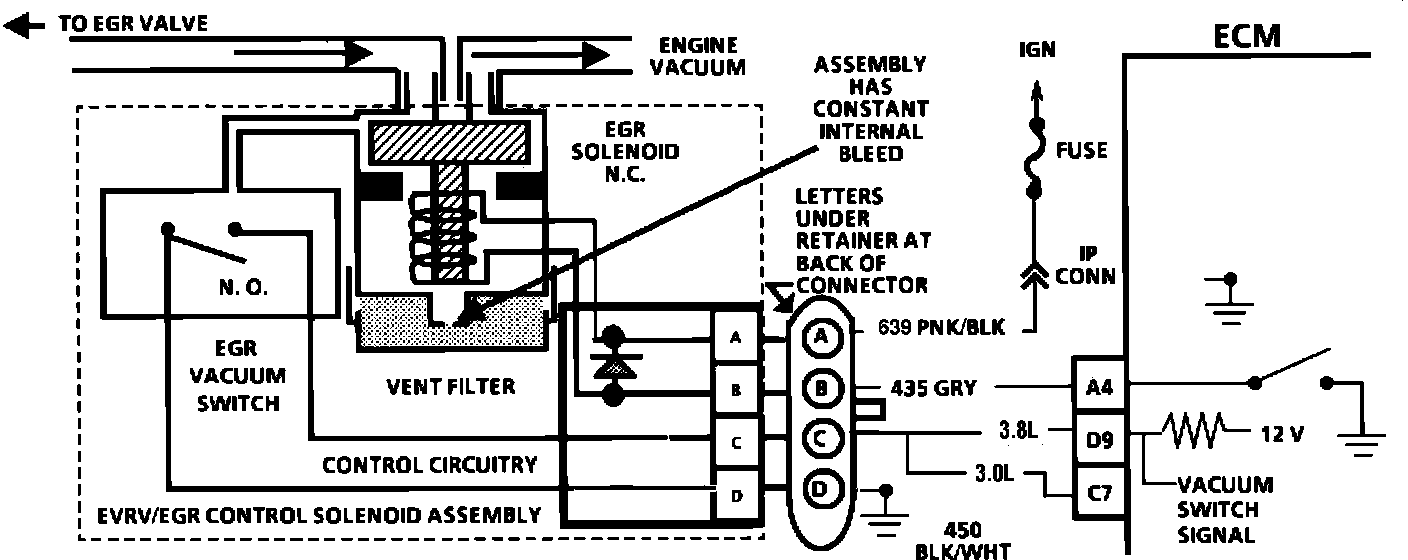 EGR Vacuum Control is accomplished by the ECM grounding CKT 435. This energizes the EGR solenoid. This is done thousands of times a second. By varing the length of "ON" time, as compared to "OFF" time, Pulse Width Modulation, (PWM), The ECM controls the vacuum source to the EGR Valve. EGR is monitored by the ECM thru the EGR vacuum switch. The EGR vacuum switch, a normally open electrical switch, has an orfice built in, which restricts the vacuum signal to the EGR vacuum switch, when sufficent vacuum reaches the EGR vacuum switch, to close the electrical switch. There should also be sufficient vacuum to open the EGR Valve.
