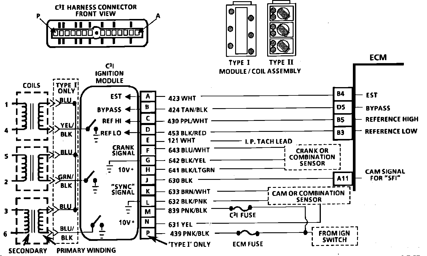 Circuit Description: The Computer Controlled Coil Ignition (C-3 I) module sends a reference signal to the Electronic Control Module (ECM), when the engine is cranking. While the engine is under 400 rpm, the C-3 I module controls the ignition timing. When the engine speed exceeds 400 rpm, the ECM sends a 5 volt signal on the Bypass circuit (424) to switch the timing to ECM control, through the Electronic Spark Timing (EST) circuit (423). An open or ground in the EST circuit will stall the engine and set a Code 42. The engine can be re-started but will run on module timing. To set a Code 42 the engine speed must be greater than 600 rpm with no EST pulse for 200 ms (open or grounded CKT 423) or, ECM commanding by pass mode. (Open or grounded CKT 424)
