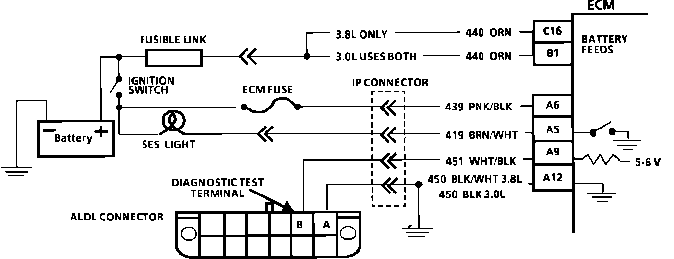 There should always be a steady "Service Engine Soon" (SES) light when the ignition is "ON" and engine stopped. Battery is supplied directly to the light bulb. The Electronic Control Module (ECM) will turn the light "ON" by grounding CKT 419 at the ECM. With the diagnostic terminal grounded, the light should flash a Code 12, followed by any trouble code(s) stored in memory. A steady light suggests a short to ground in the light control CKT 419, or an open in diagnostic CKT 451.