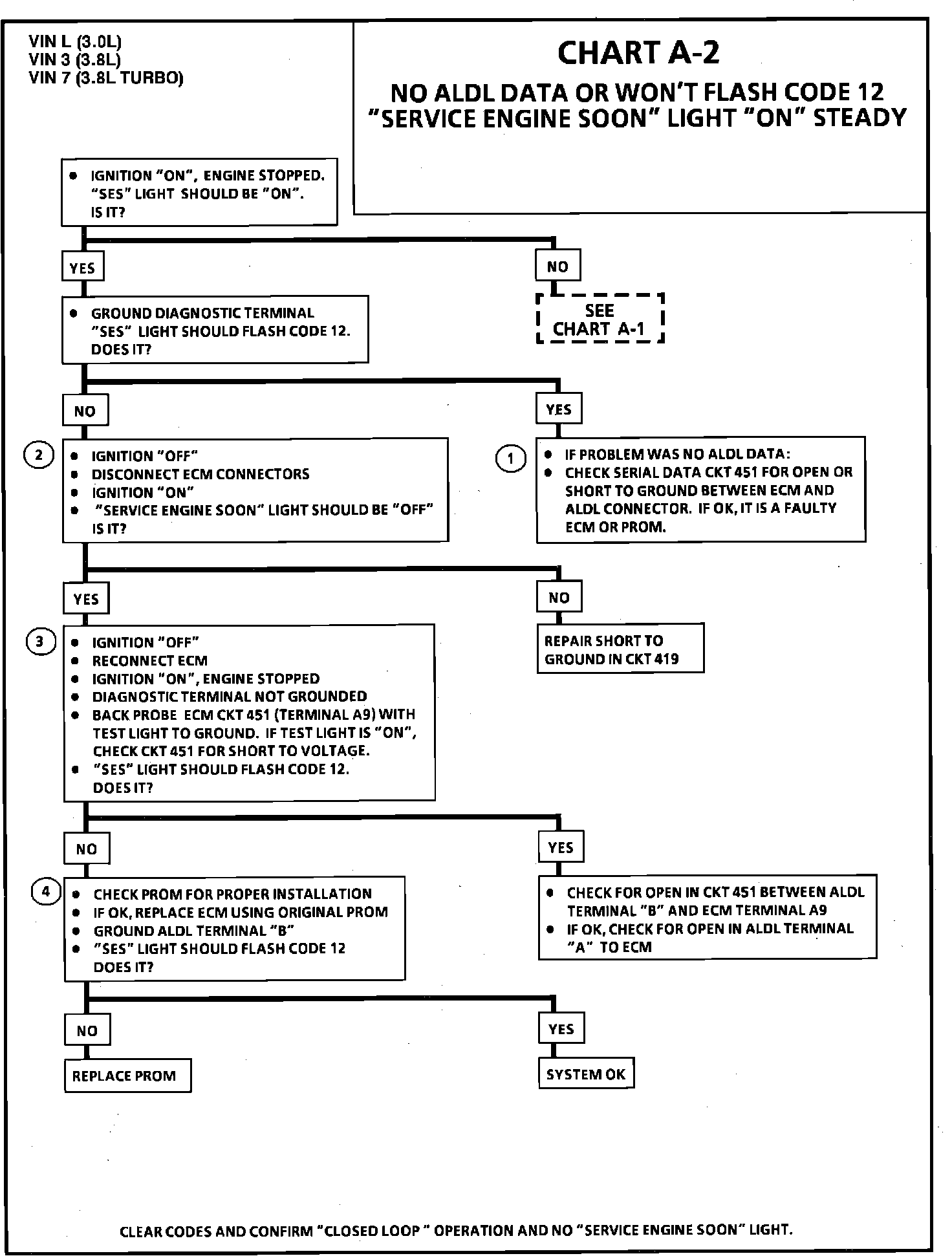 CHART A-2 NO ALDL DATA OR WON'T FLASH CODE 12 "SERVICE ENGINE SOON ON" STEADY