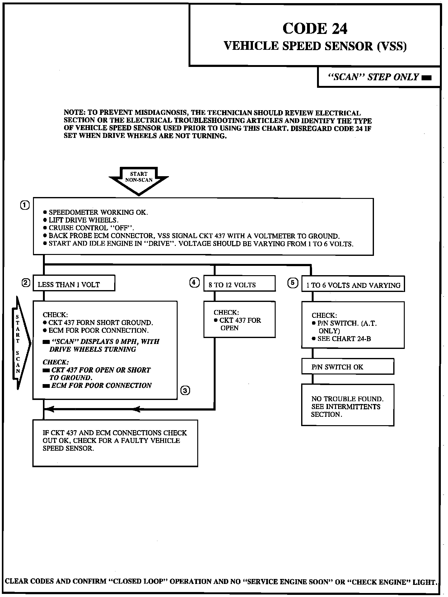 To prevent misdiagnosis, the technician should refer to the Electrical Troubleshooting Section and identify the type of vehicle Speed Sensor used prior to using this chart. Disregard a Code 24 set when drive wheels are not turning.