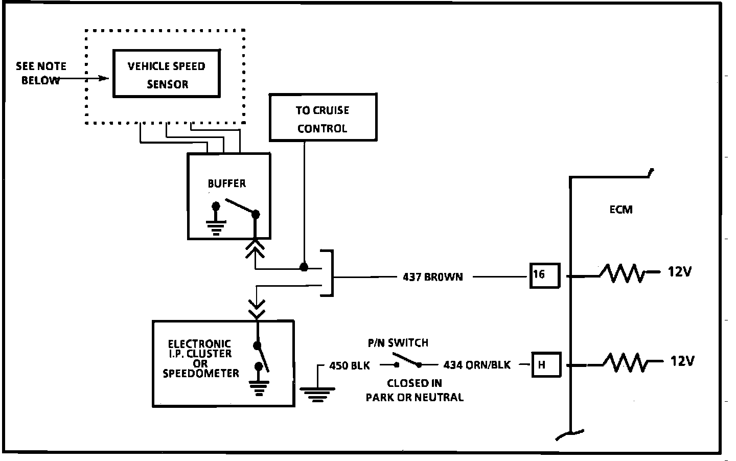 The ECM applies and monitors 12 volts on CKT 437. CKT 437 connects to the Vehicle Speed Sensor which alternately grounds CKT 437 when drive wheels are turning. This pulsing action takes place about 2000 times per mile and the ECM will calculate vehicle speed based on the time between "pulses".