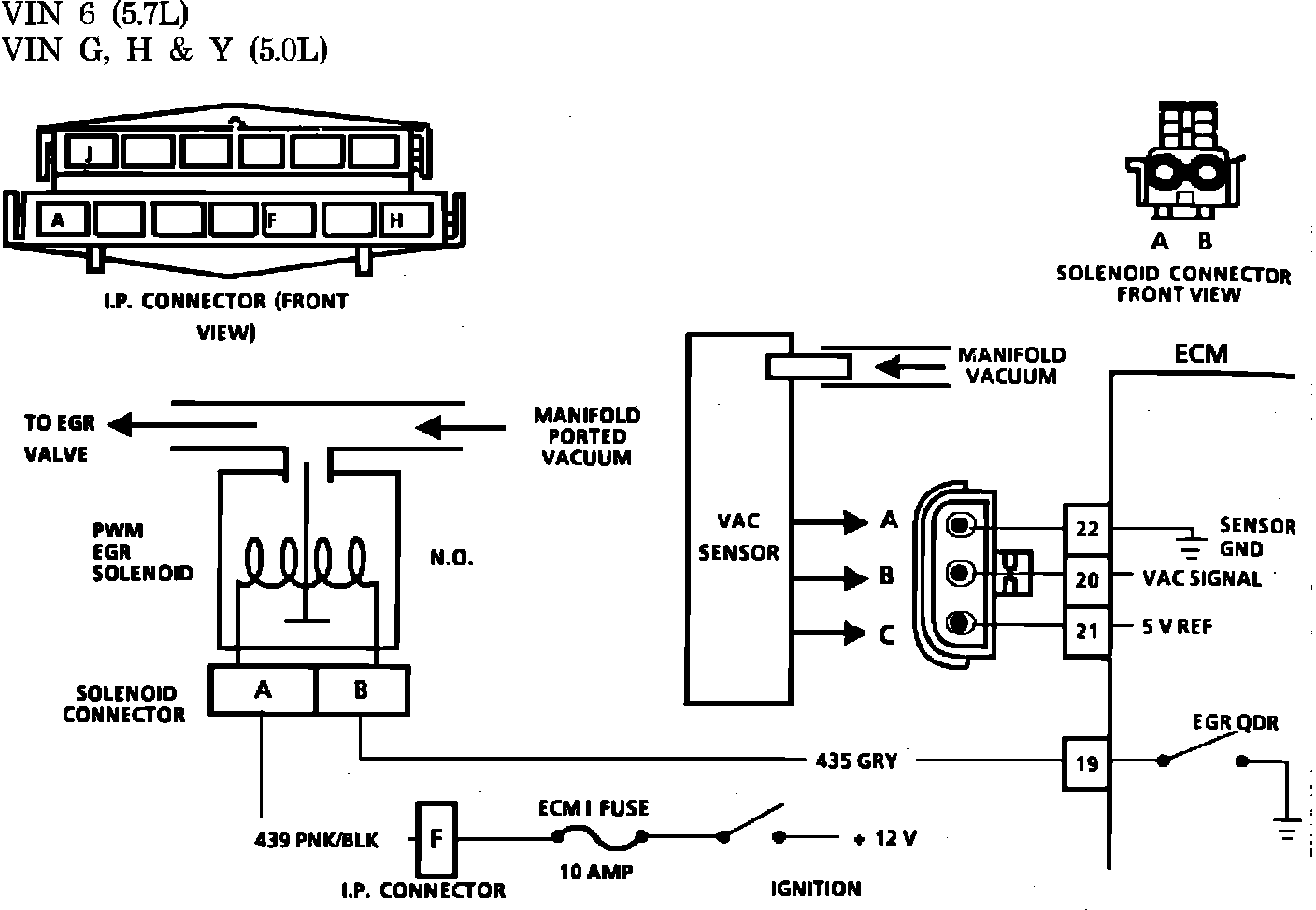 PWM EGR is an ECM control that pulses the vacuum signal to the EGR. This is accomplished through a normally open EGR solenoid which when energized by the ECM shuts off the vacuum to the EGR valve diaphragm. This system can pulse the solenoid many times per second (PWM). The ECM monitors EGR effectiveness by fully energizing the EGR control solenoid thereby shutting off control vacuum to the EGR valve diaphragm. With the EGR valve closed, manifold vacuum will be greater than it was during normal EGR operation and this change will be relayed to the ECM by the VAC sensor. If the change is not within the calibrated window, a Code 53 will be set. The EGR solenoid is always energized (EGR off) when any one of the following conditions are met: