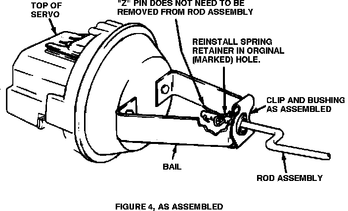 9. Install the Clip over the Bushing and Bail as shown in Figures 3 & 4. Reinstall the Servo Rod Assembly through the new Bushing by positioning the "Z" pin as shown in View "A" of Figure 2. Reinstall the spring retainer in the original (marked) hole in the rod, pointing the spring retainer in the direction shown in Figure 4.