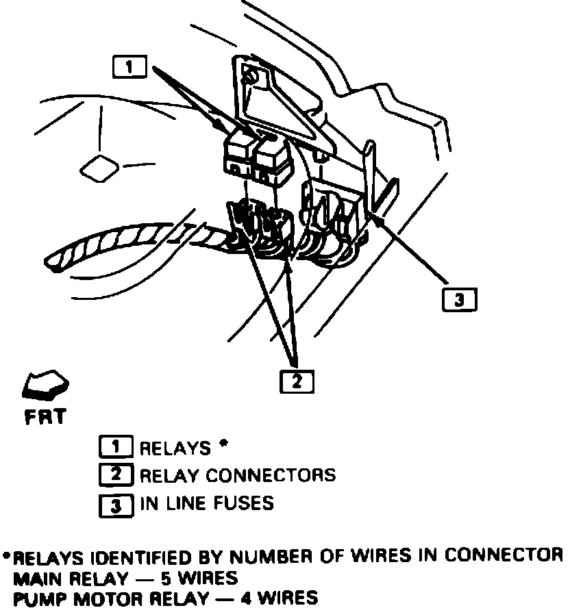 2. Replace the ABS pump motor relay, and both the ABS pump motor 30 amp fuse and the ABS main 30 amp fuse. The pump motor relay will have four wires in its connector. Relay and fuses are located on the left front of dash behind the strut tower (see Figure 1).