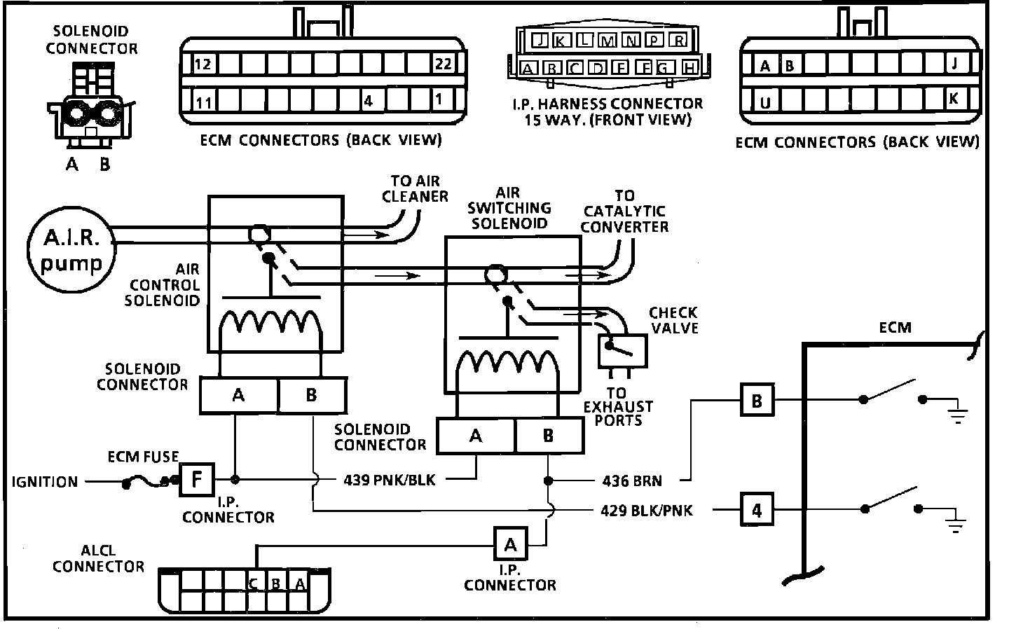 a. Air control solenoid not grounded by ECM - Air pump air diverted.