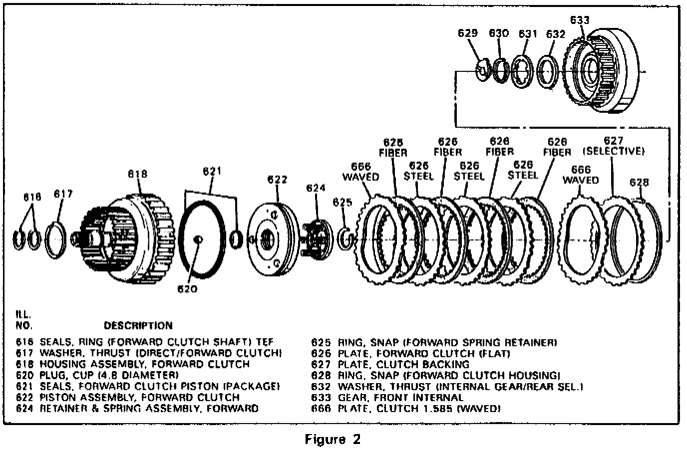 When servicing the forward clutch, select the correct backing plate (627). Backing plate selection affects piston travel, shift feel and clutch durability.
