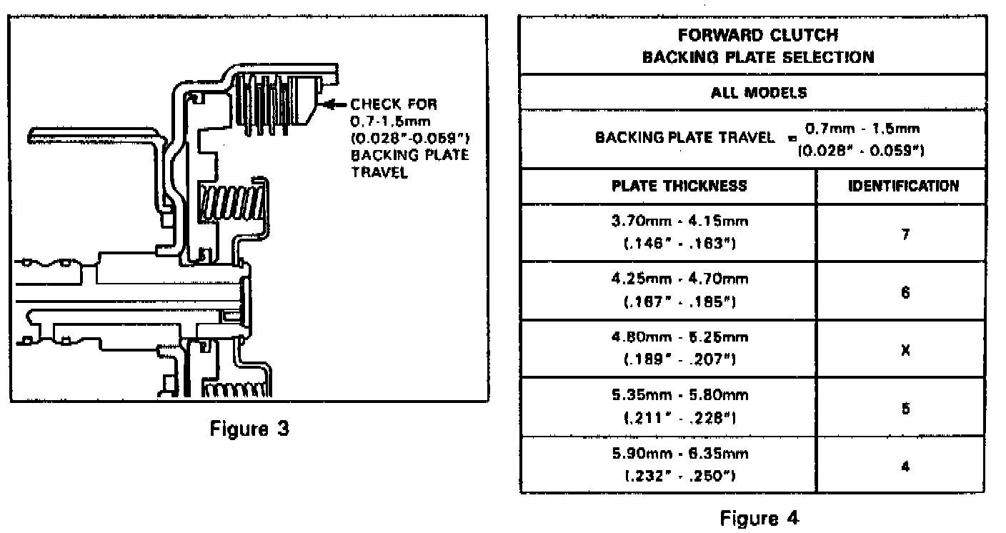 Backing Plate Selection: (Clutch Fully Assembled) Apply an evenly distributed load in the direction indicated in Figure 3 to remove slack from the clutch assembly. Use 20 lbs. (9 kg) of pressure against the backing plate -- excessive pressure will cause an inaccurate measurement. With the clutch assembly compressed, use a feeler gauge to measure the distance between the backing plate and snap ring. Correct backing plate travel is 0.7 mm-1.5 mm (0.028"-0.059"). Refer to Figure 4 for backing plate identification information.
