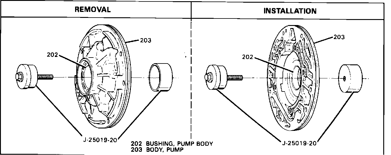 Because of the stepped bore in the pump body, removal/installation procedures and tool for the pump body bushing have been changed. Use the new available tool from Kent-Moore (J 25019-20) for removal/installation.