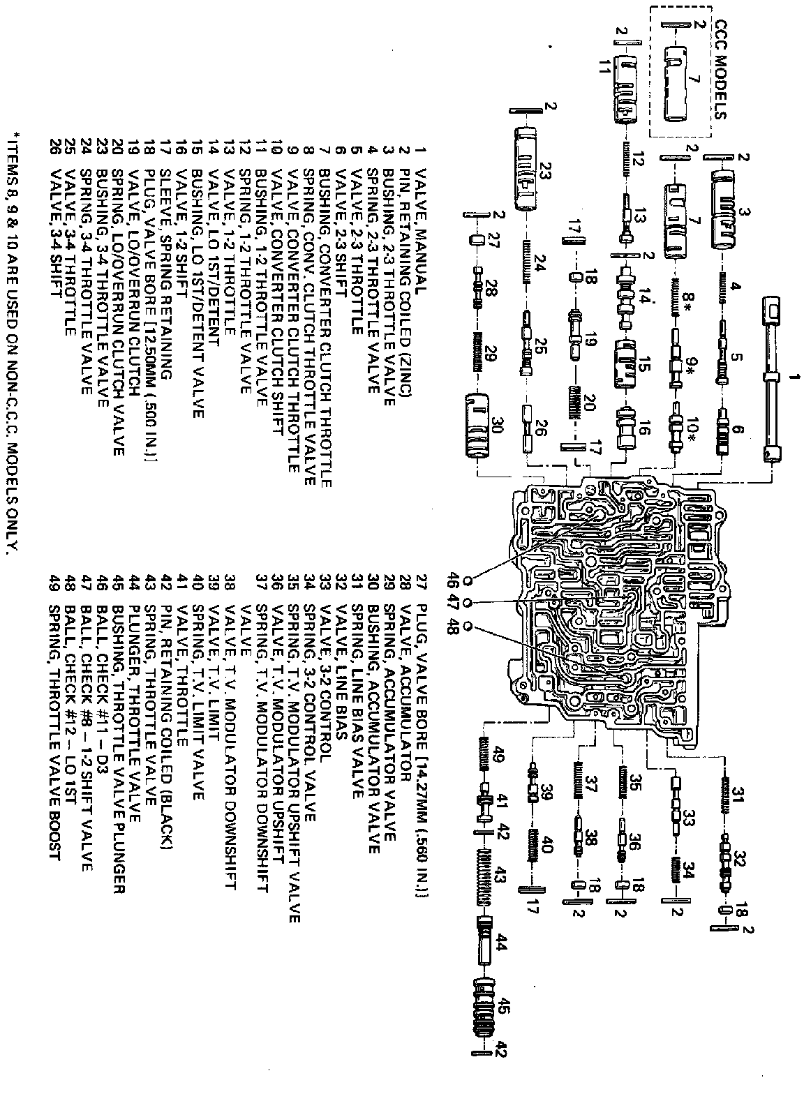 13. Into next bore up, install converter clutch shift valve with short stem end first into bore. Install converter clutch throttle valve spring into converter clutch throttle bushing and converter clutch throttle valve with stem end first into bushing. Install components with valve end first into bore. Align bushing so pin can be installed into pin slot Install roll pin.
