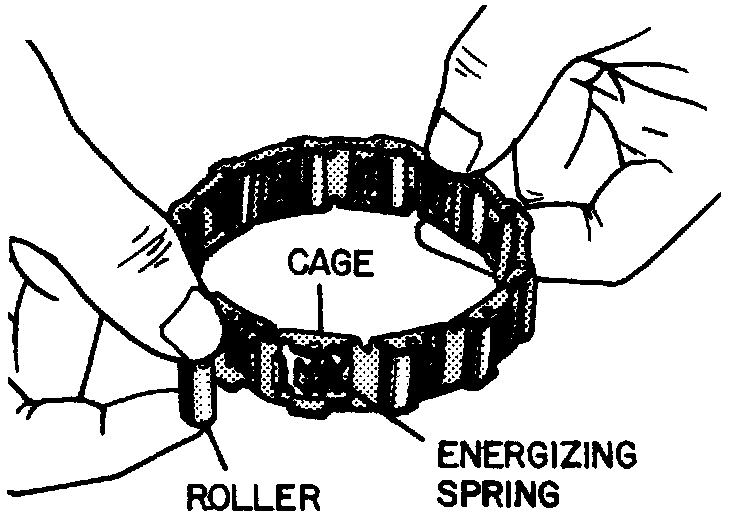 7. Install any roller bearings that may have come out of roller clutch cage. Compress energizing spring, and install roller bearings into cage from outer edge.