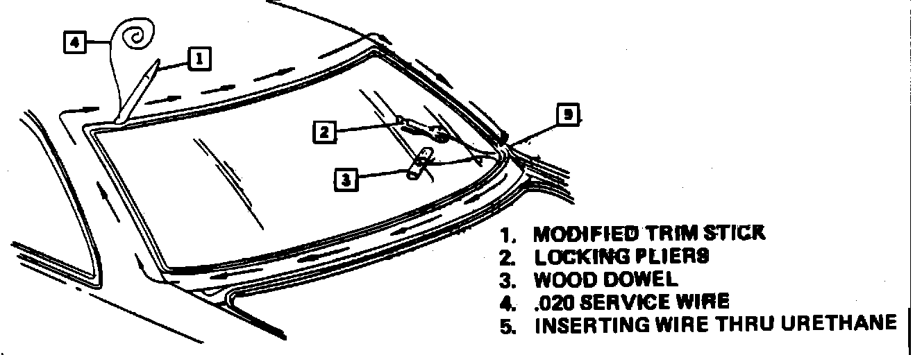 10. From outside of vehicle, using pliers, feed one end of wire through urethane at lower right corner of back glass. Pull wire end from inside to gain sufficient length to wrap wire around wooden dowel (see Figure 2). Position wire between body and module around back glass using reworked trim or fiber stick as shown In Figure 2. Insert end of wire through urethane and install locking pliers or wire as shown in Figure 2.