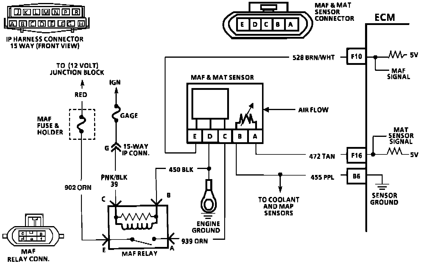 2. Checks to see if 5 volt reference signal from ECM is at MAF sensor harness connector.