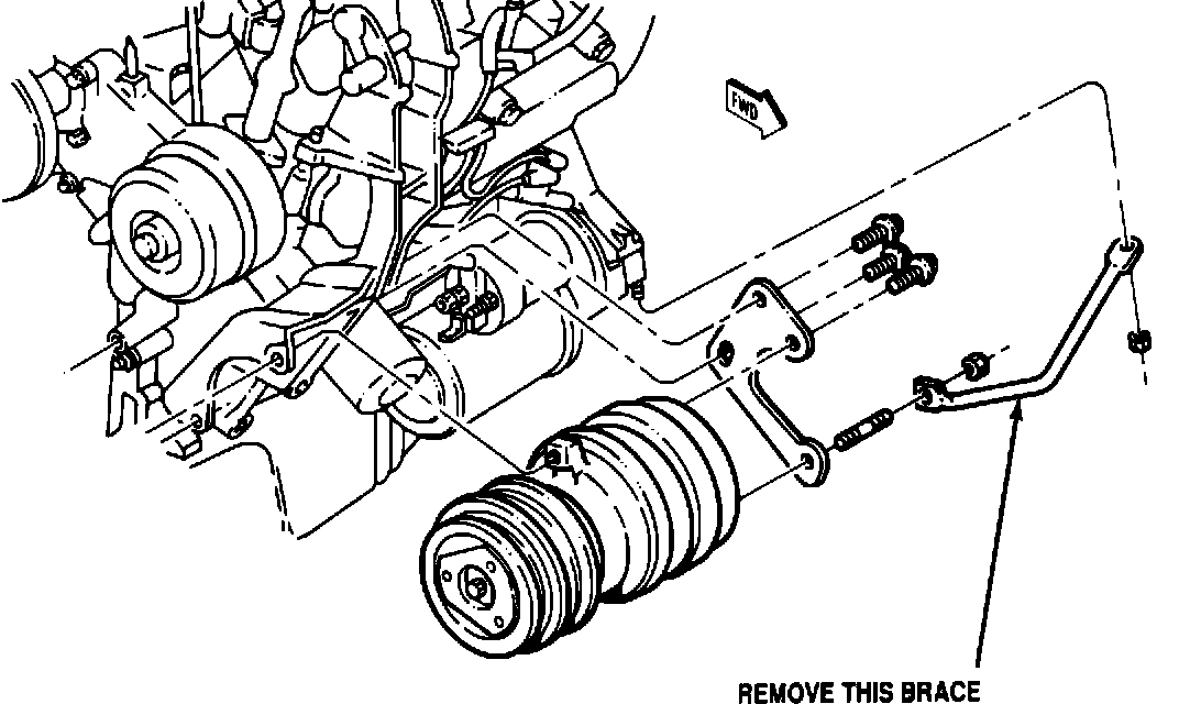 8. If the vehicle is equipped with the compressor brace, as shown in Figure 2, it should be removed and discarded before the installation of the new A/C hose assembly. This brace is no longer needed.