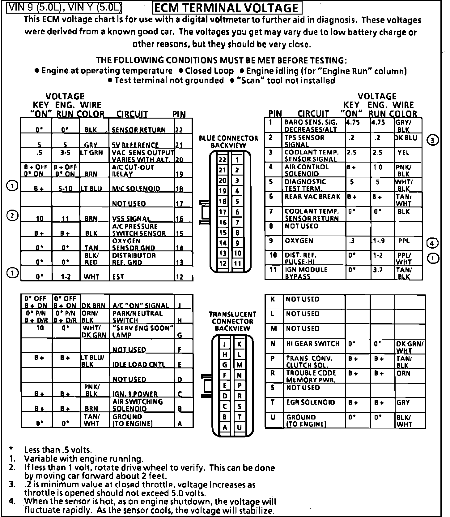 Fig. 043 - ECM Connector Terminal Identification & Voltage Specifications.: