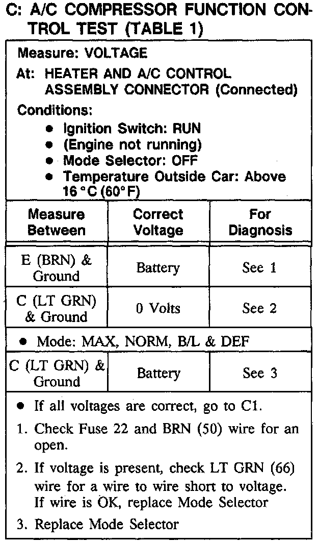 C1. Measure the voltage at terminal B of the A/C Compressor Control Relay with a fused jumper connected across the terminals of the A/C Low Pressure Cut-Out Switch connector (disconnected).
