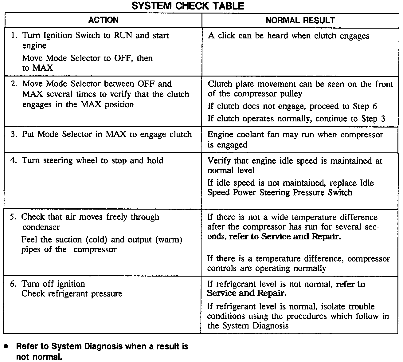 ^ Complete the A/C System Check in as a guide to normal operation of the A/C System. Testing and Inspection
