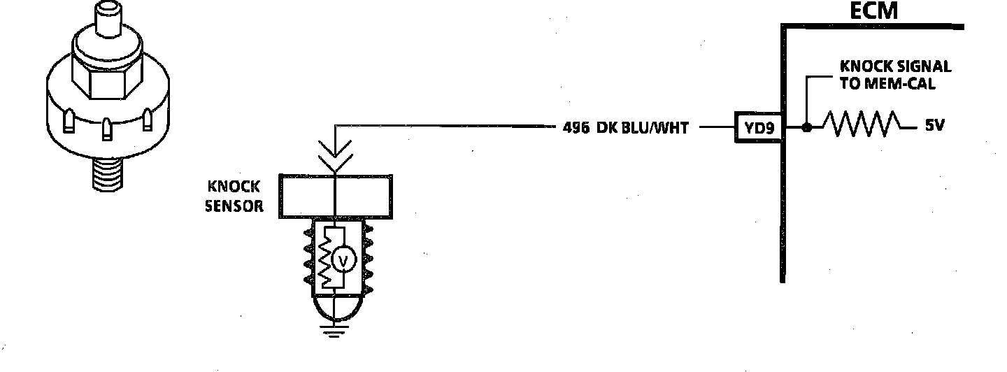 The knock sensor is used to detect engine detonation and the ECM will retard the electronic spark timing based on the signal being received, The circuitry within the knock sensor causes the ECM's supplied 5 volt signal to be pulled down so that under a no knock condition, CKT 496 would measure about 2.5 volts. The knock sensor produces an A/C signal which rides on the 2.5 volts DC voltage. The amplitude and frequency are dependent upon the knock level. The Mem-Cal used with this engine contains the functions which were part of the remotely mounted E SC modules used on other GM vehicles. The ESC portion of the Mem-Cal then sends a signal to other parts of the ECM which adjusts the spark timing to retard the spark and reduce the detonation.
