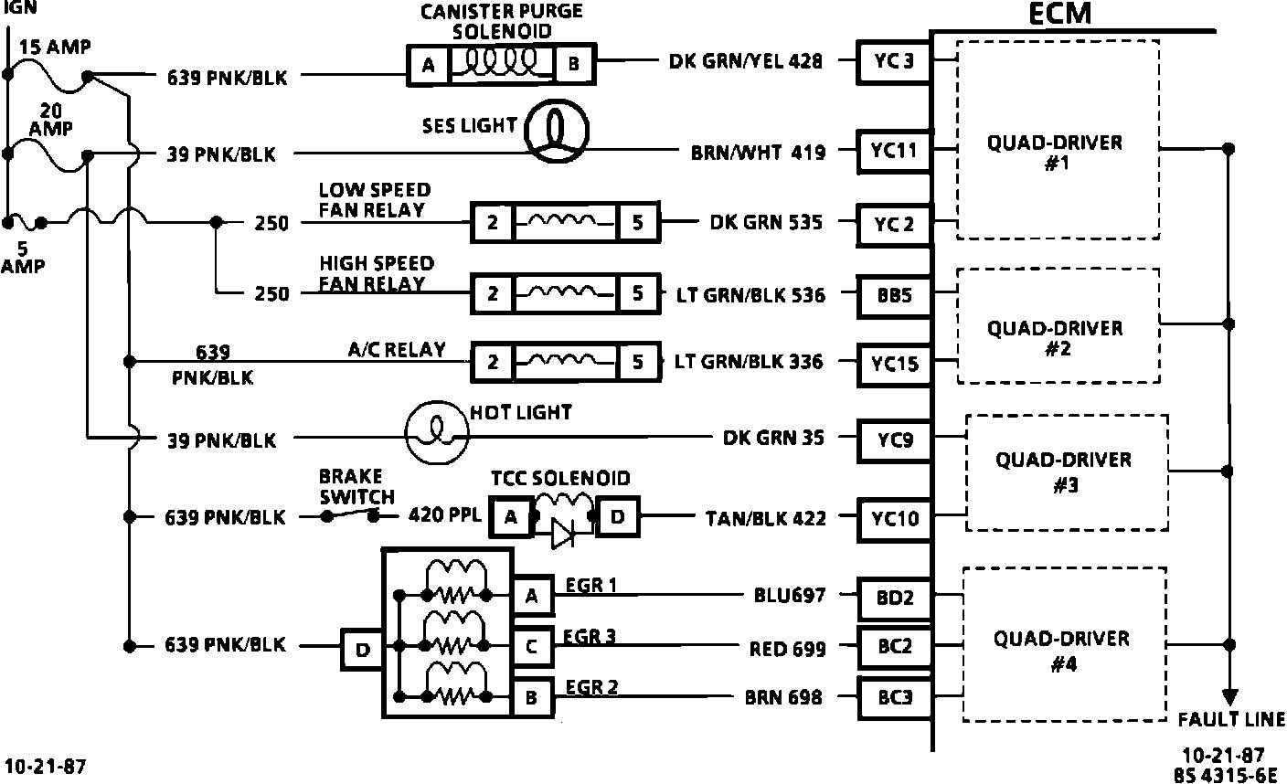 The ECM is used to control several components such as those illustrated above. The ECM controls these devices through the use of a quad-driver module (QDM). When the ECM is commanding a component "ON", the voltage potential of the output circuit will be "low" (near 0 V). When the ECM is commanding the output circuit to a component "OFF", the voltage potential of the circuit will be "high" (Near battery voltage). The primary function of the QDM is to supply the ground for the component being controlled. Each QDM has a fault line which is monitored by the ECM. The fault line signal is available on the data stream for "Scan" tool test equipment. The ECM will compare the voltage at the QDM based on accepted values of the fault line. If the QDM fault detection circuit senses a voltage other than the accepted value, the fault line will go from a "low" signal on the data stream to a "high" signal and a Code 2 6 will set if applicable. Some QDM circuits will switch from "low" to "high" normally. Examples: QDM 2 - If A/C pressure switch closes and turns "ON" high speed coolant fan or QDM 3 - If the brake is depressed. These conditions are normal and no code 26 is set. These are accepted conditions. A fault on QDM #2 will not set a Code 26, but diagnosis may be done by making sure the A/C is turned "OFF".