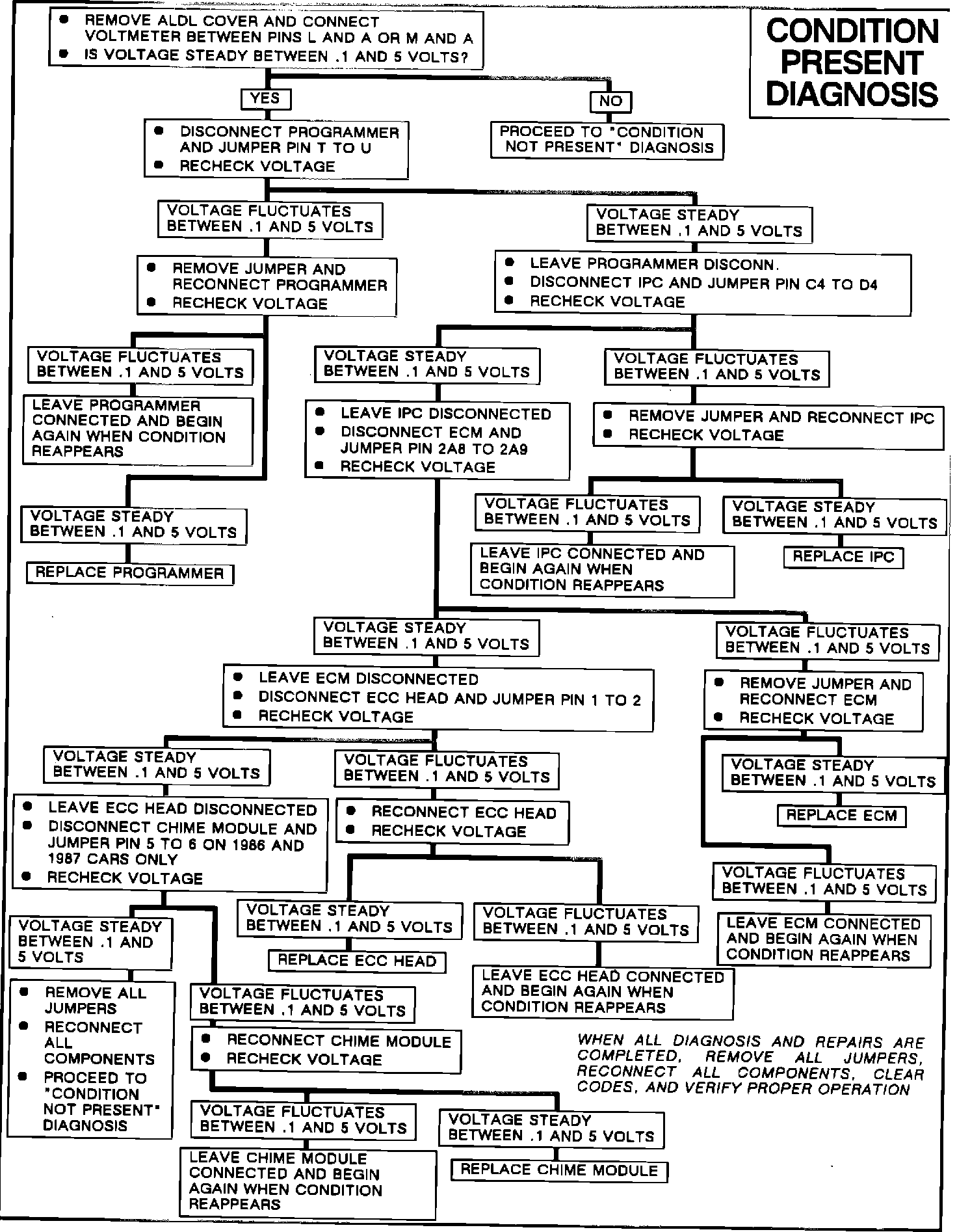 If one of the components on the serial data line is affecting the data line voltage, the serial data voltage at the ALDL connector will be a steady value anywhere between .1 and 5 volts (e.g., 2.7 V, 3.5 V, etc.). To determine which of the components is causing the condition, it is necessary to try and isolate the component using the following CONDITION PRESENT DIAGNOSIS chart. (Refer to Figure 1)