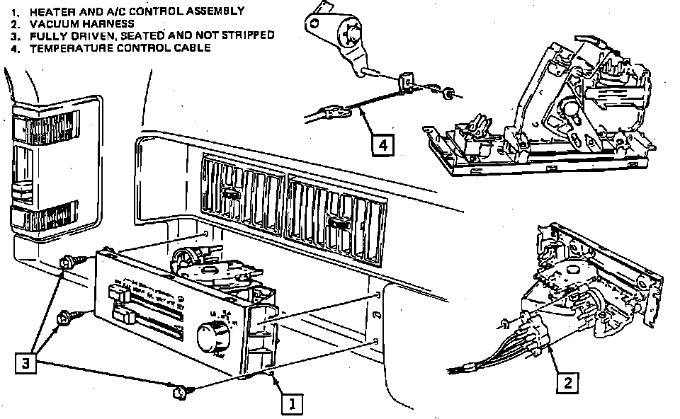 9. Pulling control head rearward, disconnect both illumination bulbs, blower switch connector, rotary switch connector, vacuum harness and temperature cable.