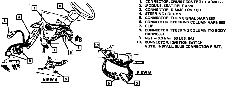 16. Unplug high beam dimmer switch, ignition switch, turn signal, brake light, TCC, cruise and clutch start connectors, Fig. 148.