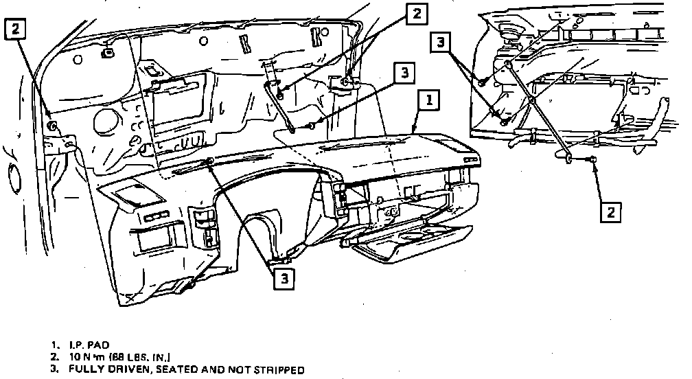 11. Remove two screws from instrument panel to console bracket, then remove two nuts from instrument panel pad to cowl.