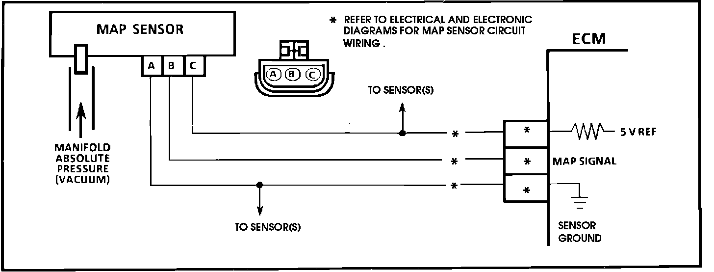 The manifold Absolute Pressure Sensor measures the changes in the intake manifold pressure which results from engine load and rpm changes; and converts these changes into a voltage output. The ECM sends a 5 volt reference voltage to the MAP sensor. As the manifold pressure changed, the output voltage of the sensor also changes. By monitoring the sensor output voltage, the ECM knows the manifold pressure. A low pressure (low voltage output) will be around 1-2 volts at idle. While higher pressure (high voltage output) will be around 4-4.8 volts at wide open throttle. The MAP sensor is also used under certain conditions as a barometric pressure sensor. This allows the ECM to make certain adjustments for altitude. The ECM uses the MAP sensor to adjust fuel delivery and ignition timing.