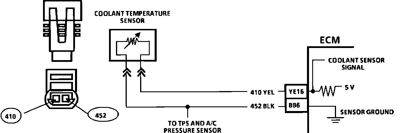 The coolant temperature sensor uses a thermistor to control the signal voltage at the ECM. The ECM applies a voltage on CKT 410 to the sensor. When the engine is cold, the sensor (thermistor) resistance is high, therefore, ECM terminal "YE16" voltage will be high.