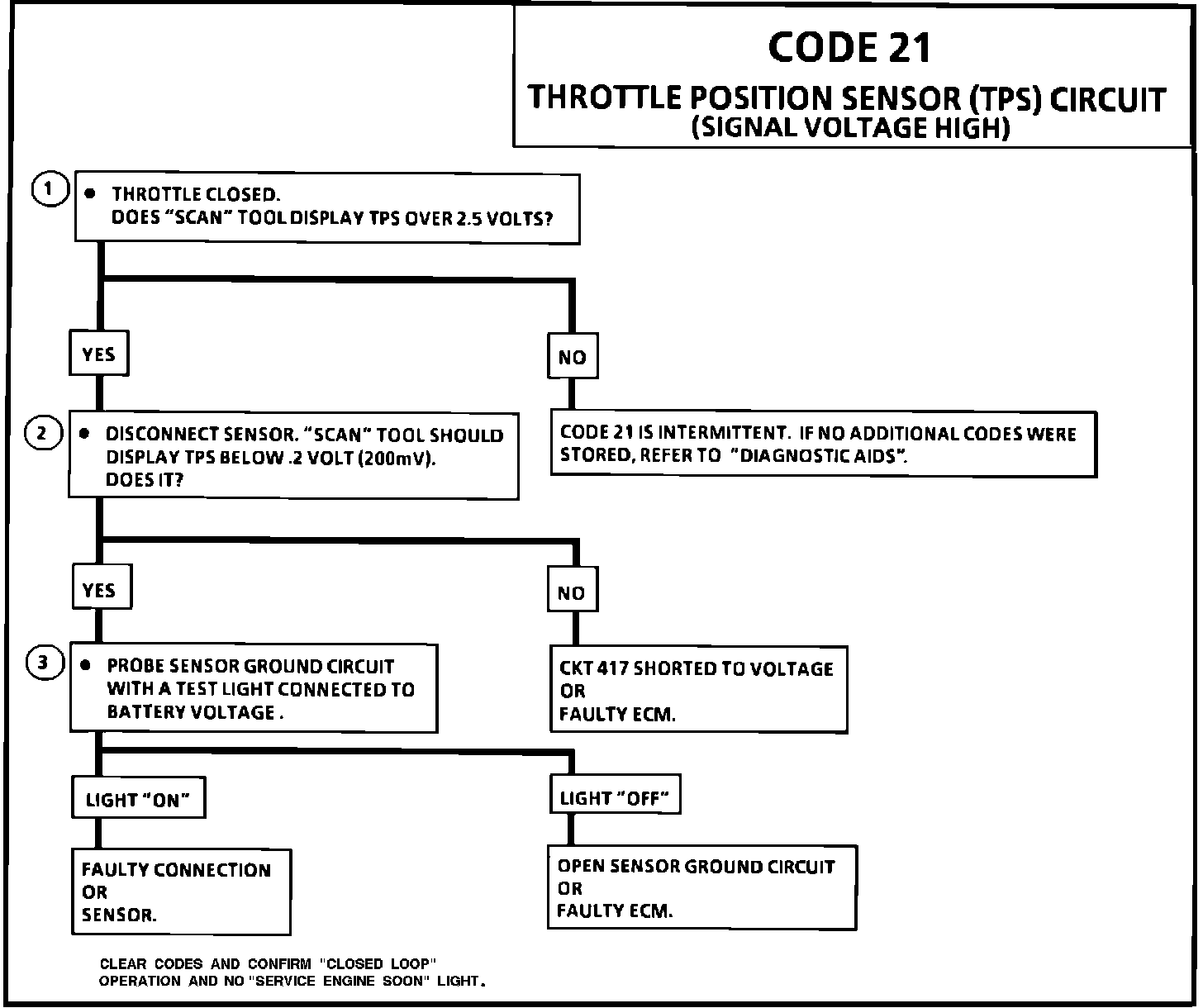 ^ Codes 15, 21 and 66 stored at the same time could be the result of an open CKT 452. "Scan" TPS while depressing accelerator pedal with engine stopped and ignition "ON". Display should vary from below 500 mV (.5 volts) when throttle is closed, to over 4500 mV (4.5 volts) when throttle is held wide open.