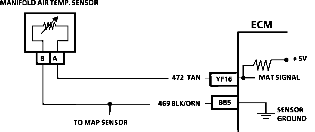 The MAT sensor uses a thermistor to control the signal voltage at the ECM. The ECM applies a voltage (about 5 volts) on CKT 472 to the sensor. When the air is cold the sensor (thermistor) resistance is high, therefore the ECM terminal "YF16" voltage will be high. If the air is warm the sensor resistance is low, therefore the ECM terminal "YF16" voltage will be low.