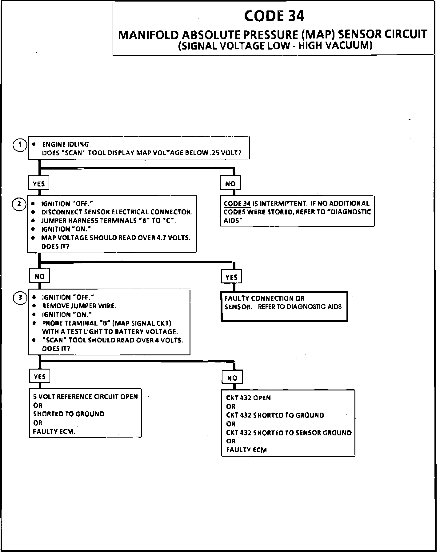 1. This step determines if code 34 is the result of a hard failure or an intermittent condition. A code 34 will set when MAP signal voltage is to low and the ignition is "ON."