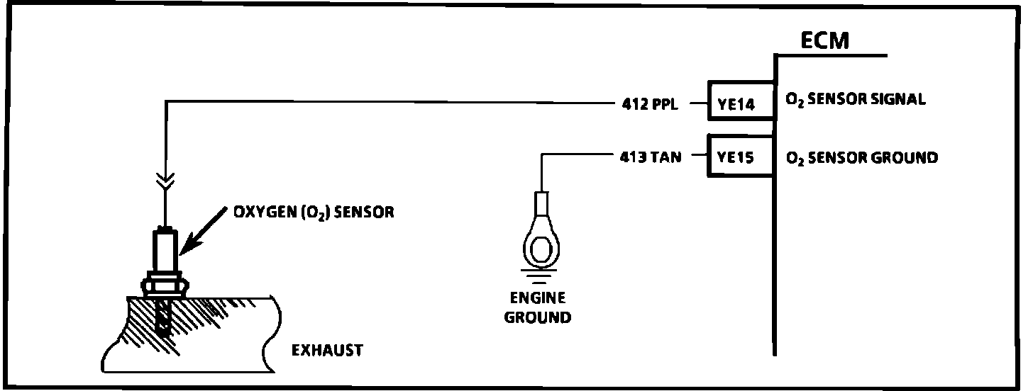 The ECM supplies a voltage of about 0.45 volt between terminals "YE14" and "YE15". (If measured with a 10 megohm digital volt meter, this may read as low as 0.32 volt.) The 02 sensor varies the voltage within a range of about 1 volt if the exhaust is rich, down through about 0.10 volt if exhaust is lean.