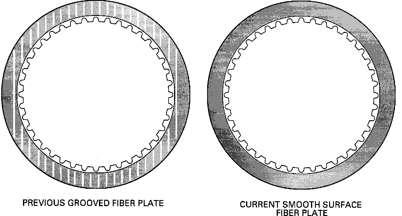 New smooth surface fiber plates for the Lo-Reverse clutch went into production May 5, 1989, (Julian Date 125), for Willow Run built HYDRA-MATIC 3T40 transaxles and May 15, 1989, (Julian Date 135) for Windsor built HYDRA-MATIC 3T40 transaxles.