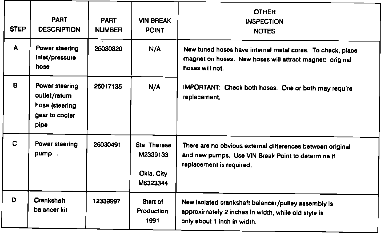 Utilizing the Inspection/Analysis Chart shown, determine which of the power steering or engine components indicated have NOT been previously installed on the suspect vehicle.