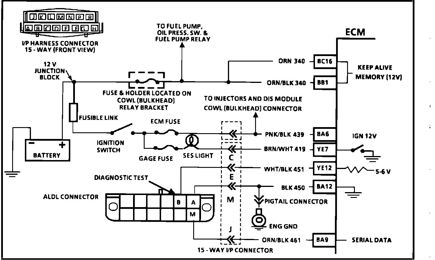 There should always be a steady "SERVICE ENGINE SOON" (SES) light when the ignition is "ON" and engine stopped. Battery is supplied directly to the light bulb. The Electronic Control Module (ECM) will control the light and turn it "ON" by providing a ground path through CKT 419 to the ECM.