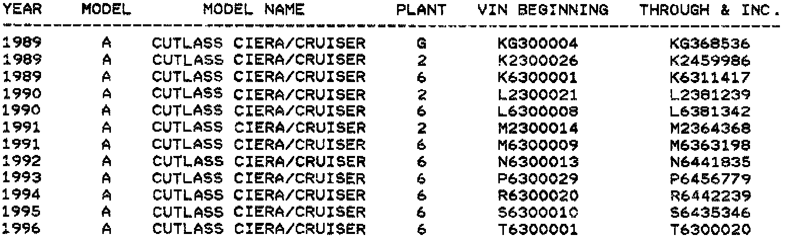 All 1989 - 1996 Oldsmobile Cutlass Ciera and Cutlass Cruiser vehicles within the breakpoints as shown.