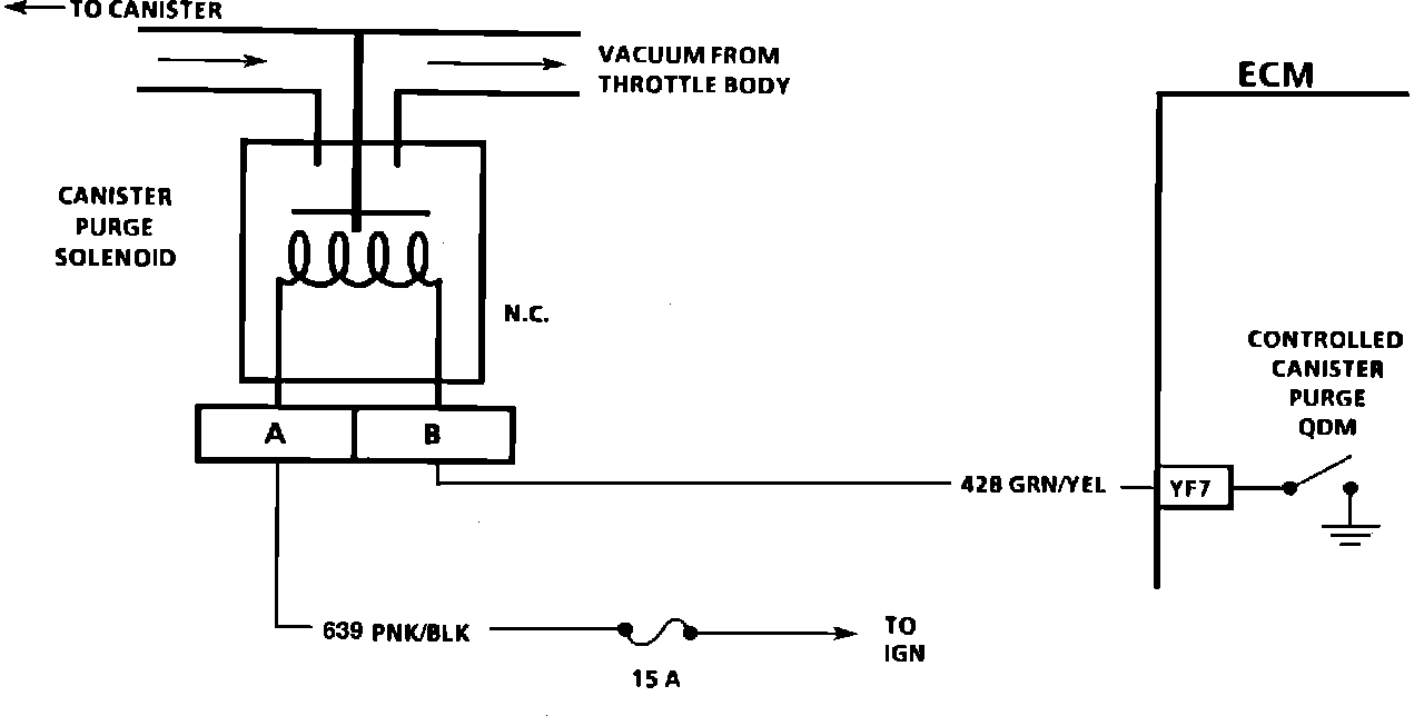 The canister purge is controlled by a solenoid that allows vacuum to purge the fuel vapor canister when energized. The ECM controls the ground to activate the solenoid. The purge solenoid is energized, if the diagnostic test terminal is grounded with the engine not running, or the following exists with the engine running:
